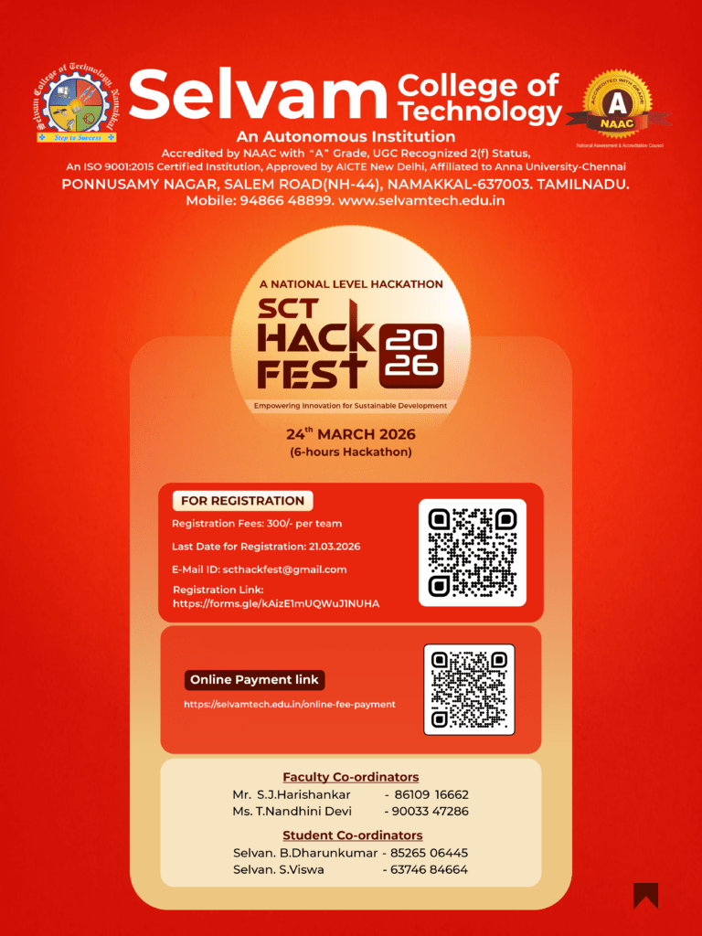 A National Level Hackathon SCT-HackFest 2026 Posted by Website Admin SCT Categories Events Date 06/03/2026 Share: Website Admin SCT Previous post SMART WAREHOUSE USING IOT 06/03/2026 Next post International Women’s Day Celebration 07/03/2026 You may also like National Conference on Innovations in Information, Computing, and Artificial Intelligence Technology – NCIICAIT 2K26 28/02/2026 Brochure-CSE,IT & AI&DS Faculty Development Programme on IIoT, AR/VR, and Drone Technology. 25/02/2026 National Conference on Emerging Trends in Electrical, Electronics, Biomedical Engineering and Sustainable Sciences – NCEEEBS 2026 19/02/2026