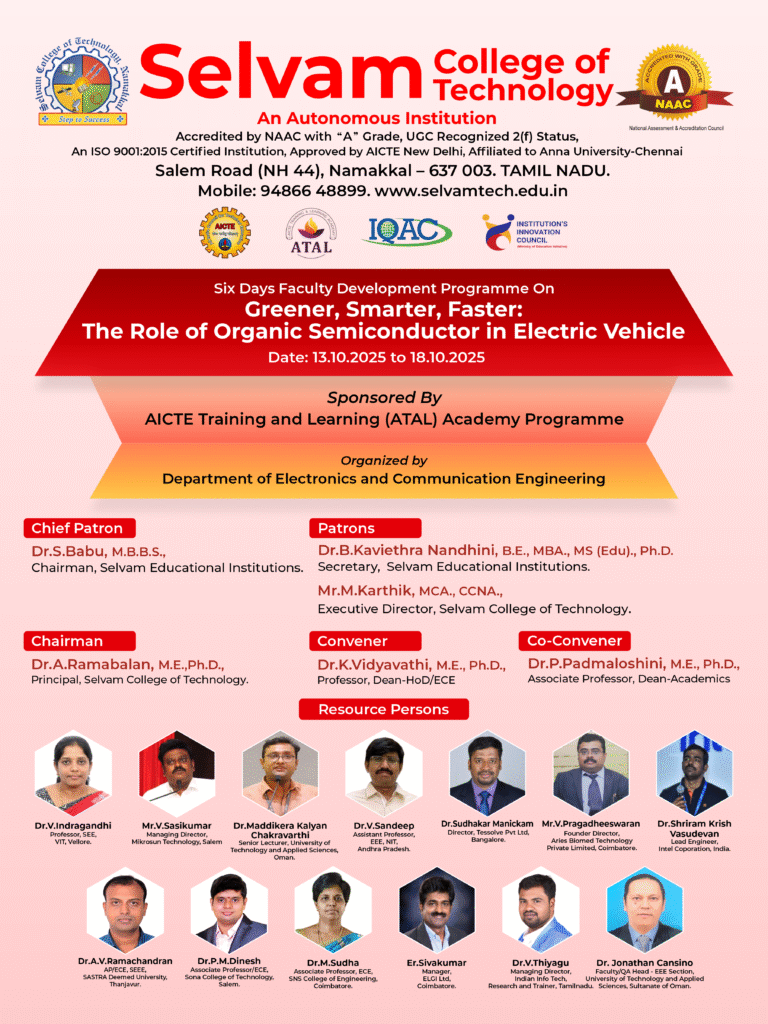 The Department of Electronics and Communication Engineering, Selvam College of Technology, Namakkal, successfully organized a six-day AICTE-ATAL Faculty Development Programme (FDP) on “Greener, Smarter, Faster: The Role of Organic Semiconductors in Electric Vehicles.” from 13th to 18th October 2025.