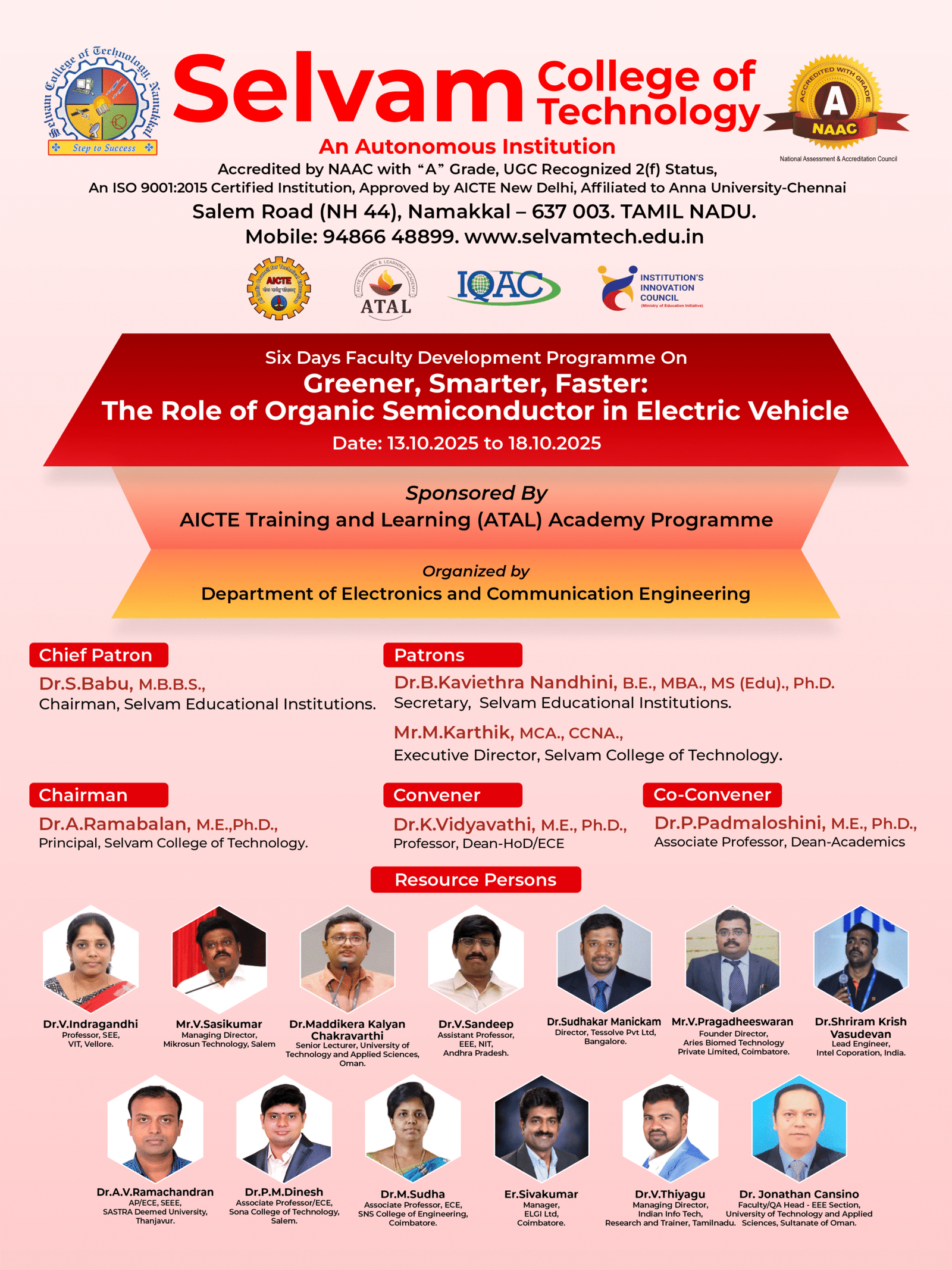The Department of Electrical and Electronics Engineering, Selvam College of Technology, Namakkal, organized a One Day Workshop on “Industrial Electrical IoT: Designing Intelligent Control and Protection Systems and Hands-on Training in Industrial Electrical IoT” on 31.01.2026 (Saturday) for EEE students. …