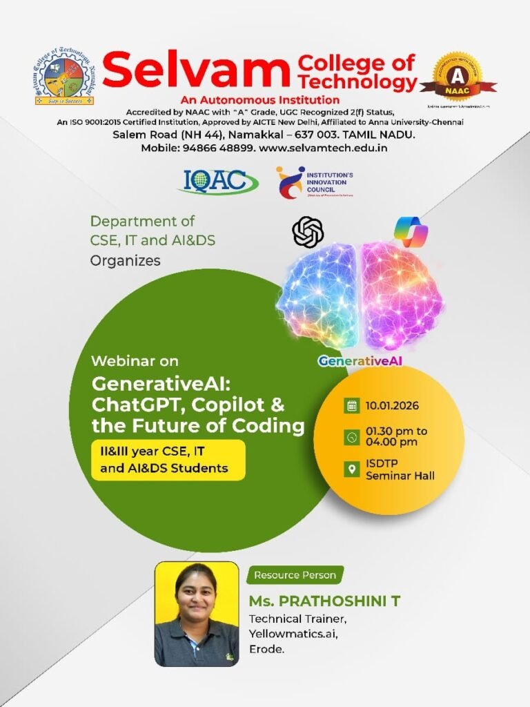 The Department of Computer Science and Engineering (CSE), Information Technology (IT), and Artificial Intelligence & Data Science (AI&DS), Selvam College of Technology, successfully organized a Webinar on “Generative AI: ChatGPT, Copilot & the Future of Coding.”